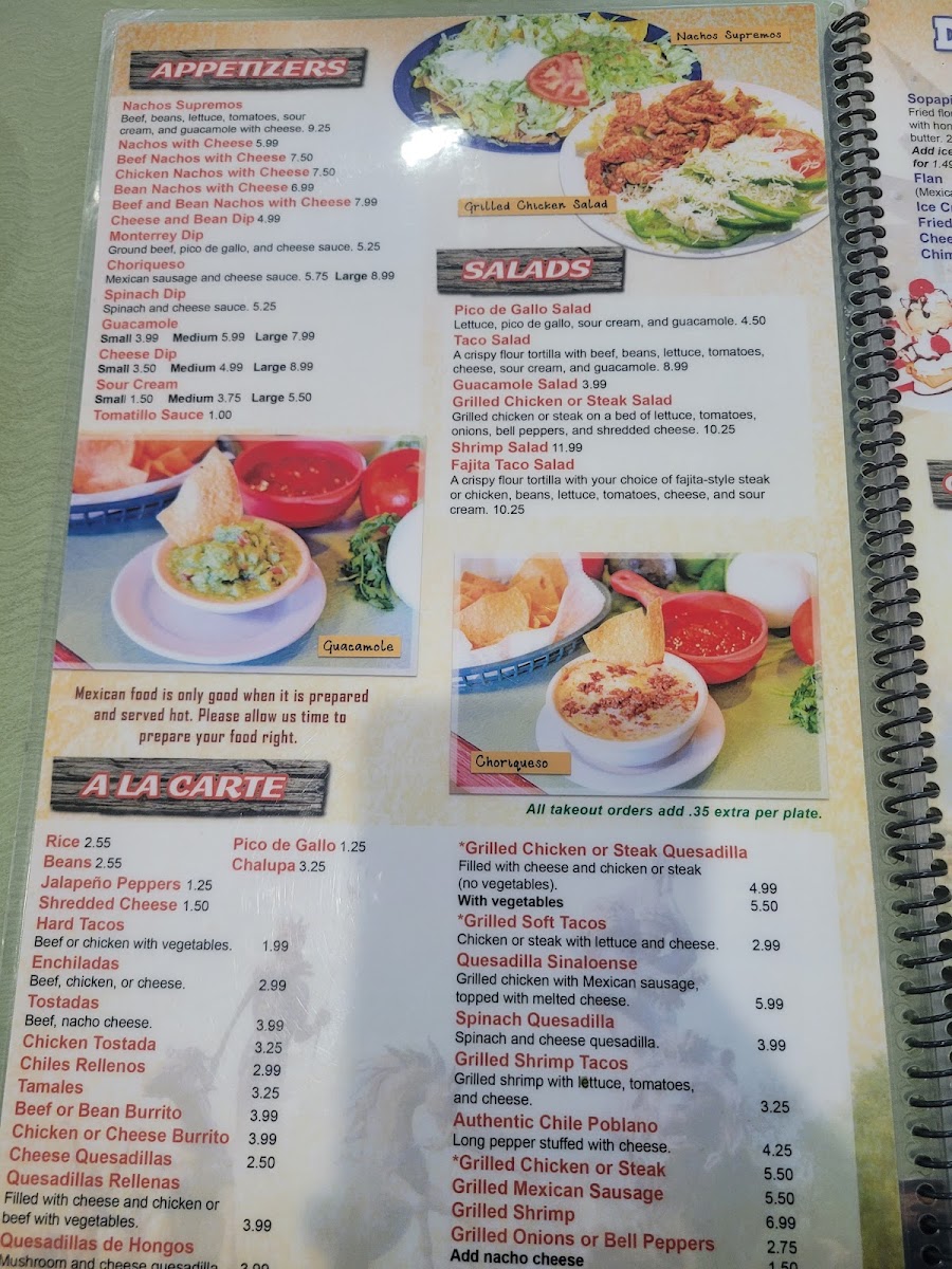 “ Mexican restaurants are always a plus, we entered inside and got ourselves a table, seats were comfortable and the waiter immediately asked us for our drinks, quick timing. I felt a little pressured when being asked to order as I had just sat down but no big deal. They have a ton on their menu, and I mean a LOT, so much that I took pictures of every side. We got rice and beans, nice nice. Along with a chicken quesadilla, classic. The chicken and cheese go perfectly together and the final meal we got were the street tacos but not gonna lie, they had little to no flavor on them but maybe that's just me. Also, there was some Spinach dip, that looked like queso but just spinach with it and another one that I wasn't too familar with, overall a great experience. ”